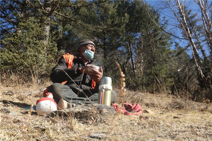 巡山護(hù)林的路并不好走,很多羊腸小道都是盤旋在陡坡峭壁之間,有的地方甚至需要小心翼翼側(cè)身而過。在巡山過程中,澤翁仁真總是非常仔細(xì)地邊走邊看,查看林中是否有非法進(jìn)入人員活動(dòng)的痕跡,是否有亂砍濫伐、非法盜獵的情況。他總是眼觀六路、耳聽八方,觀察林中的風(fēng)吹草動(dòng),經(jīng)常是汗流浹背。累了就找塊空地坐著小憩一會(huì)兒,餓了就拿出背包里的酥油茶和糌粑,簡單的吃上幾口,而此時(shí)的酥油茶早就沒了剛打好的滾燙,僅剩一絲余溫。