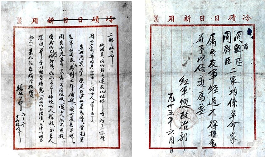 1935年6月2日,劉伯承同志寫給2師政治部的信。周奕庭是劉伯承順、瀘起義部隊的團長,起義失敗后轉(zhuǎn)入地下,1932年在成都被捕后遇害。紅2師先頭部隊抵達化林坪時錯將其家屬當(dāng)作 “土豪”,抓走其弟媳。劉伯承同志為此給2師政治部寫信,說明其家為革命烈屬。其弟媳很快得到釋放,其家屬也得到了保護。
