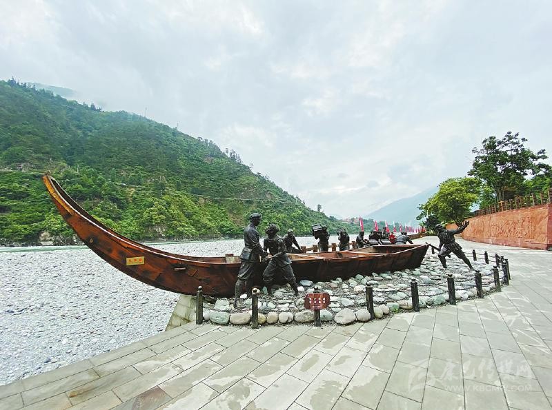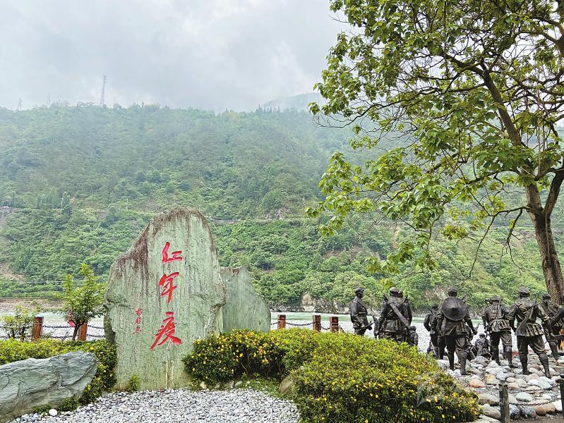 不遠處的安順場渡口、大渡河邊,矗立著一座“紅軍渡”石碑,上面的三個鮮紅大字由渡河時任第一軍團第一師一團團長楊得志題寫。石碑旁陳列著的一艘長10.5米、寬2.3米、高2.2米的“紅軍船”,正是當年紅軍強渡大渡河時使用的翹首木船復制品。木船旁,是戰(zhàn)士和當?shù)卮兿蚰敬\送武器裝備的雕像,斜坡上,勇士隊伍正奔向渡口。