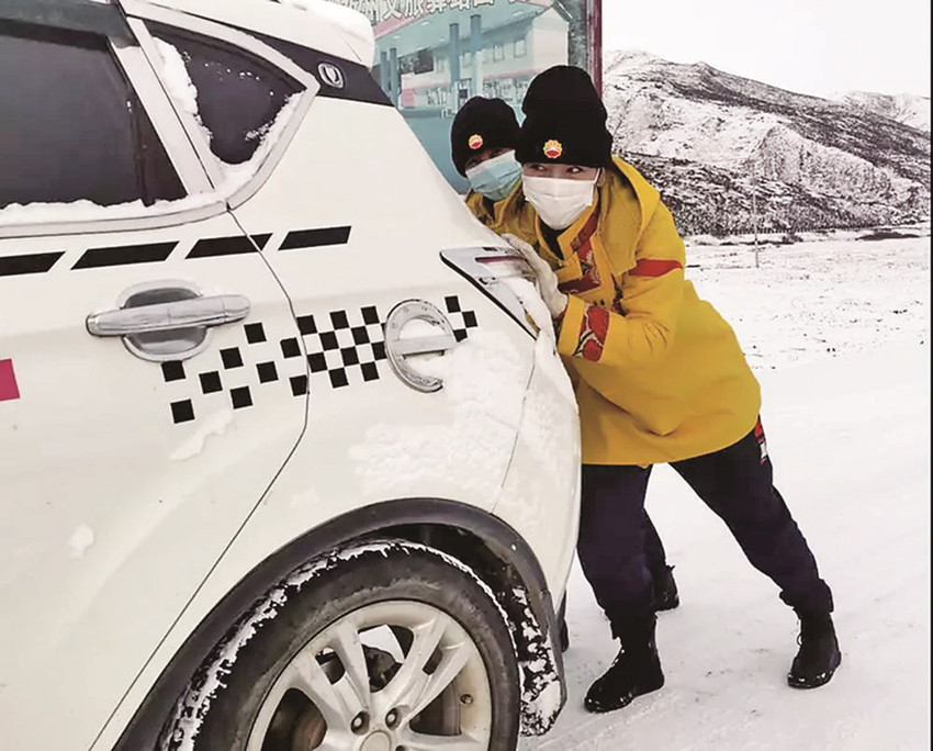 在安撫好客戶后,澤仁娜姆連夜敲開當?shù)嘏沙鏊拈T,開具好散裝汽油灌裝證明,帶上裝滿20升汽油的油桶、氧氣袋和治療高原反應藥品及食品,冒大雪、頂嚴寒,第一時間前往救援現(xiàn)場。經(jīng)過兩個多小時的驅(qū)車跋涉,終于找到求救人員,并將越野車引領到自己的加油站休整。