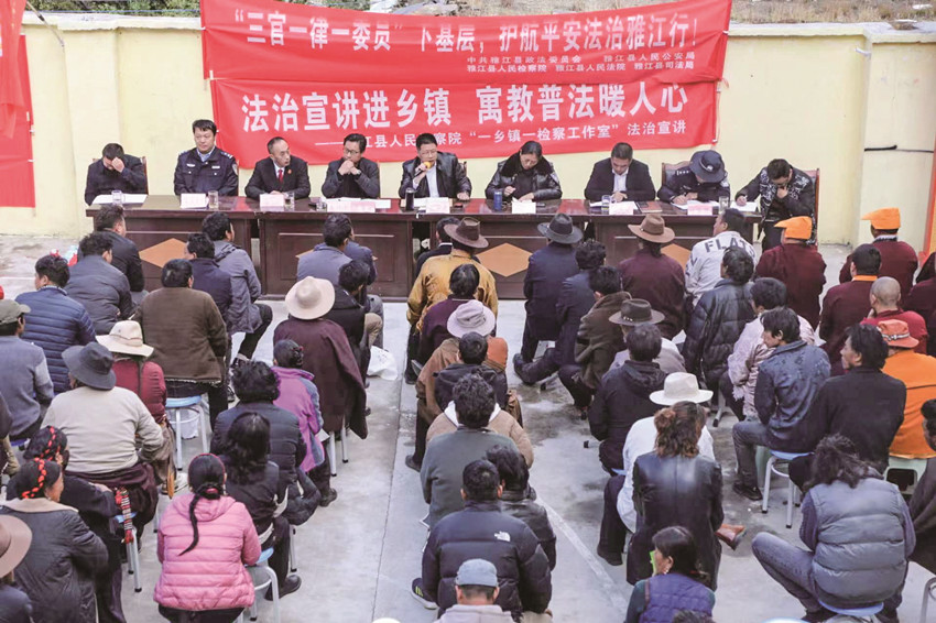 “三官一律一委員”通過高效整合法官、檢察官、警官、律師、政法委員五支力量,緊緊圍繞“155533”市域社會治理總體發(fā)展思路,以“五治融合”為目標,通過“縣級+鄉(xiāng)鎮(zhèn)”的人員配置、“政策+法律”的職能作用、“法條+案例”的豐富內(nèi)容、“宣講+提問”的互動方式,將單一的宣講工作變?yōu)槎嘣恼勑恼勗?,形成新的“五位一體”工作方法,并致力于化解“五大風險”,強化“五大建設”,同時鞏固市域社會治理現(xiàn)代化工作成果,探索構(gòu)建合縱之環(huán)、合縱之勢、合縱之力,為建設更高水平的平安雅江、法治雅江提供了更加堅實的法治保障。
