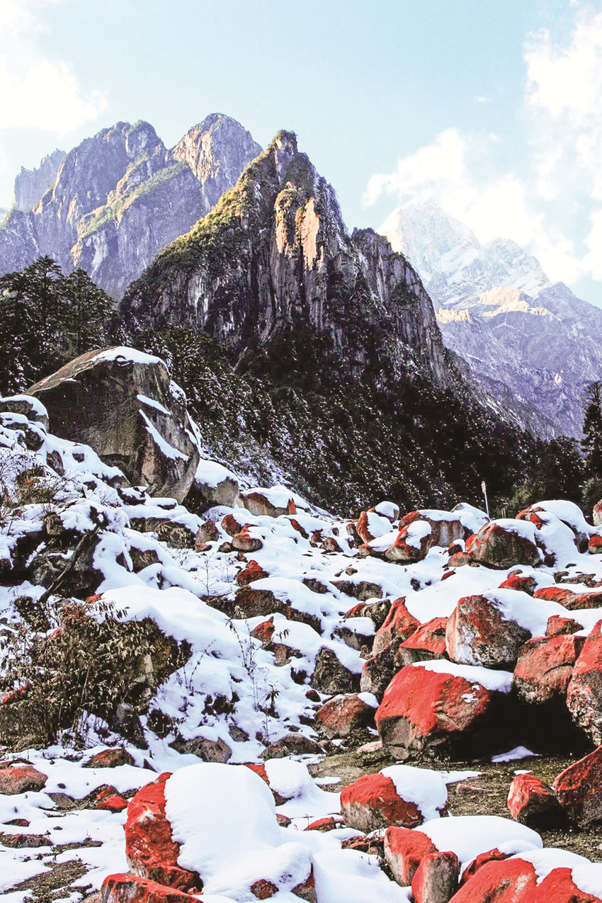雪山、藍(lán)天白云和黨嶺村的彩林構(gòu)成一幅優(yōu)美的畫卷。新華社 發(fā)