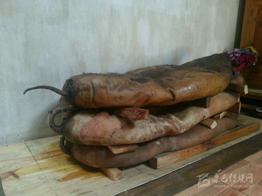 半干豬肉:在丹巴縣革什扎鄉(xiāng)有一種比較奇特的豬肉保存方法:將豬殺死后,不去毛,只在豬的腹部開一條口子取出內(nèi)臟,將血水清理干凈后用麻繩將腹部縫合。隨后用當?shù)氐狞S泥漿敷在豬身上,在豬的身上形成一個厚約2厘米的殼,密不透風。處理好后將其懸掛于灶塘之上,使黃泥在高溫的烘烤下快速硬化。如若發(fā)現(xiàn)黃泥層出現(xiàn)裂縫,立即用黃泥漿將其修復。等到第二年熱天時,敲掉黃泥形成的硬殼,豬毛被輕松退去,豬肉依然比較新鮮。但這種保存新鮮豬肉的方法現(xiàn)在已經(jīng)很少見了,一是因為這種保存方法風險太大,稍有不慎豬肉就可能腐敗;二是如今物資供應豐富,新鮮豬肉購買方便,使得此種儲存方式失去了存在的價值。