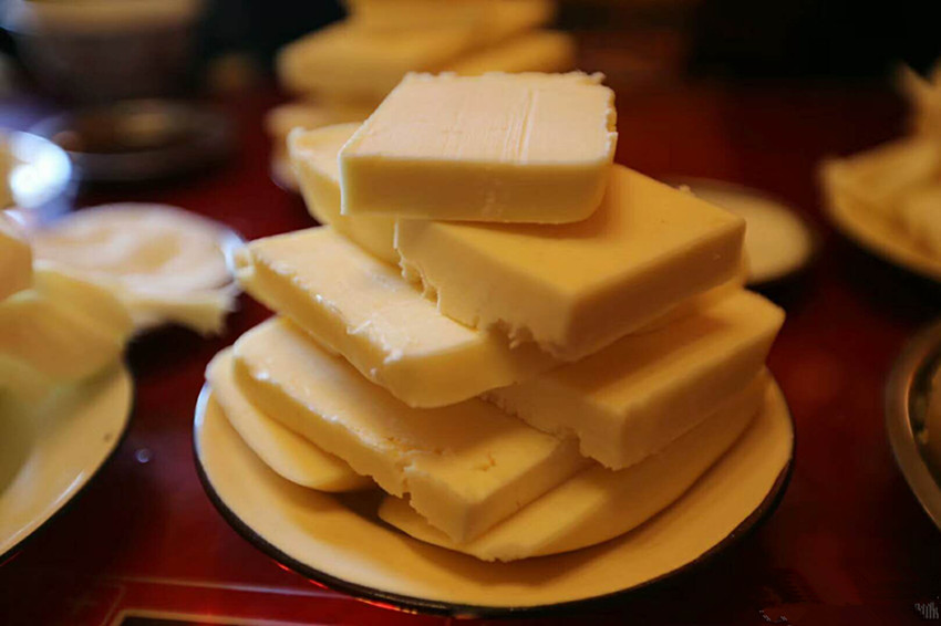 酥油是藏族民眾主要的食用油脂。藏族諺語(yǔ)說(shuō):“沒(méi)有駿馬的草原不美,沒(méi)有酥油的糌粑不香?!辈刈迕癖姶蛩钟筒?、揉糌粑都離不開(kāi)酥油。據(jù)史料記載,文成公主入藏時(shí),帶去了內(nèi)地的茶葉,公主“使乳變成奶酪,從乳取酥油”,有了茶和酥油,才有了酥油茶。