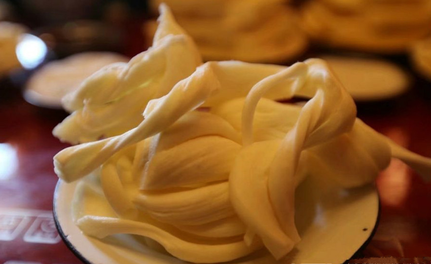 酥油古稱醍醐,元代才開(kāi)始叫酥油。元代宮廷食醫(yī)思慧在《飲膳正要》中記述了酥油的提取方法:“取凈奶子,不住手用阿赤打,取浮油者為思馬哥油,今亦云曰酥油?!蔽闹小鞍⒊唷笔翘崛∷钟偷哪酒?。提取酥油有專門(mén)的酥油桶,桶里有一個(gè)連桿木柄,倒上牛奶,蓋上桶蓋后,連續(xù)上下抽動(dòng)連桿木柄數(shù)百上千次,黃澄澄的酥油塊就全部浮在上面了。把酥油塊用手捏成坨,擠去水份,丟進(jìn)清水里泡一會(huì)兒,就可以食用了?,F(xiàn)在牧區(qū)打酥油普遍用奶油分離器,既快又省。