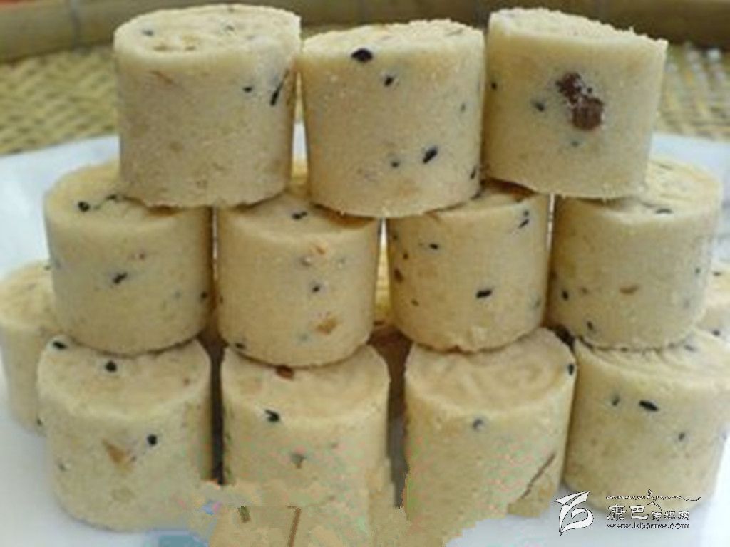 八寶年糕 原料 糯米1000克,白糖、麻仁青梅、葡萄干、瓜條、白蓮、桃脯、豬油各20克。 做法 先將糯米淘洗干凈,水浸24小時后上蒸籠蒸爛,取出用木棒搗爛攤涼,把白糖等搓勻成餡,在方盤內刷豬油,鋪上搗爛的1厘米厚的糯米飯,每鋪一層放入適量的餡,共鋪3層,蒸熟后用刀切為小塊即成。 夾心年糕 原料 糯米1000克,青紅絲、小豆、白糖各50克。 做法 將糯米洗凈浸泡24小時后上蒸籠蒸爛,取出用木棒搗爛后展切成2塊,把小豆煮爛加糖再加青紅絲做成餡撒于其中一塊上,再將另一塊放在餡上壓實壓緊,用刀切成塊即可。