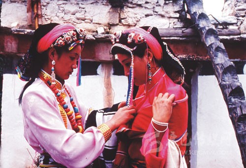 康區(qū)婦女戴頭帕很有特色,嘉絨婦女繡花頭帕,以長方形帕對折,戴于頭上,額前伸出約3公分,腦后下垂至后枕,寬至兩鬢,然后用大紅頭繩或五彩頭繩辮發(fā)盤于帕上,辮子套各式辮飾??的蠇D女戴頭帕時,額前折褐成帽狀,腦后成巾狀下垂至肩。木雅婦女戴袋狀帽,將帽沿一側(cè)內(nèi)疊扣于買上,上沿額伸出頭額前約3公分,寬至兩鬢,長約30公分的袋狀帽箭垂于腦后,然后用大紅頭繩或五彩頭繩編發(fā)辮纏盤于帽上。魚通人則用長丈余之青綾布纏裹頭部,形成碩大的盤頭。