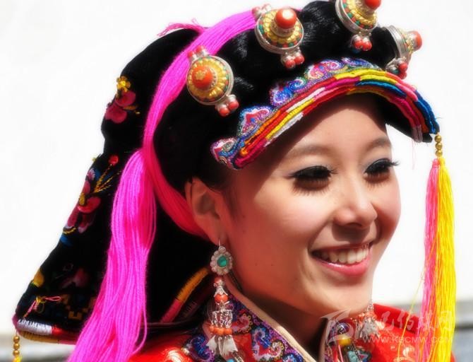 婦女的傳統(tǒng)服裝主是坎肩連衣百折裙。顏色有深絳、深紅、深綠等,上面印著孔雀翎眼彩花,折裙一展如孔雀開屏。上身著彩色襯衫,外套一件齊膝開襟的長(zhǎng)衣,其領(lǐng)子、坎肩、大襟、袖口和底邊均鑲有彩色金絲料或水獺皮、豹皮等裝飾,腰間束一條彩帶,腰前圍一面彩色緞圍腰,并佩帶銀制或珊瑚制品等裝飾,同時(shí)耳掛金銀耳環(huán),頸戴寶石項(xiàng)珠,手腕戴銀圈、玉圈,手指戴金戒、銀戒,腳穿白色藏靴,顯得艷麗、俊俏、大方。